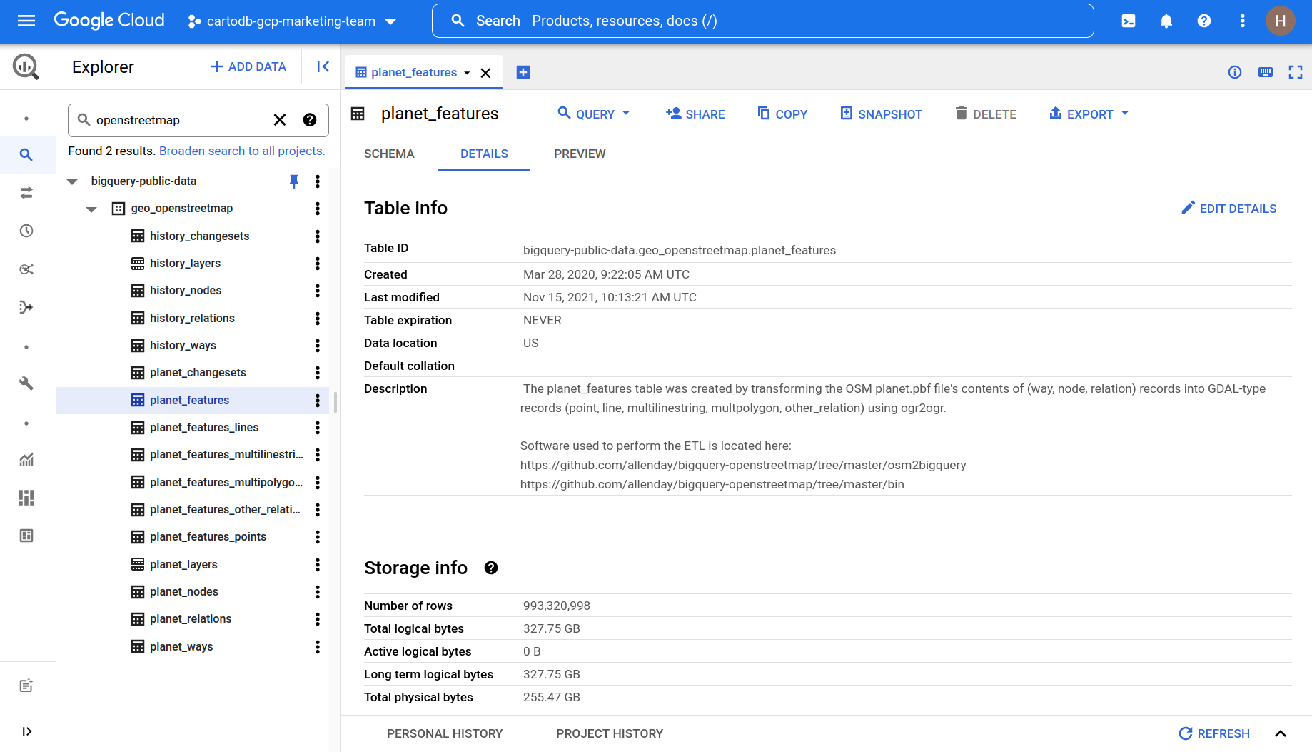 This data is extracted from OpenStreetMap by Google and then uploaded on a weekly basis to their public data warehouse. Currently Google have paused this project and CARTO is actively working with them to resume this.
