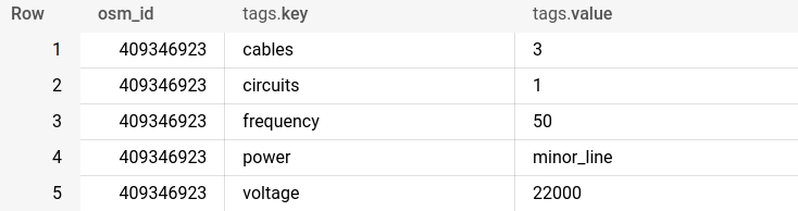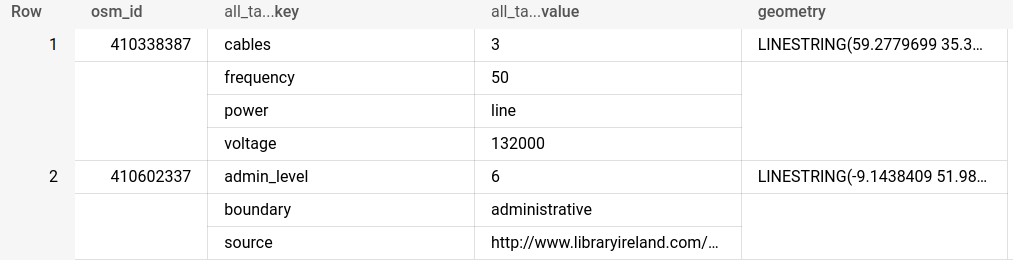 Instead of using the BigQuery console, try running this query from the SQL console in CARTO Builder to see these features on a map. Do you see the problem here? We have five individual records, each with a different key-value pair - but with the same osm_id meaning these all relate to just one feature on a map. If we were to map this with CARTO, we’d have five identical points.