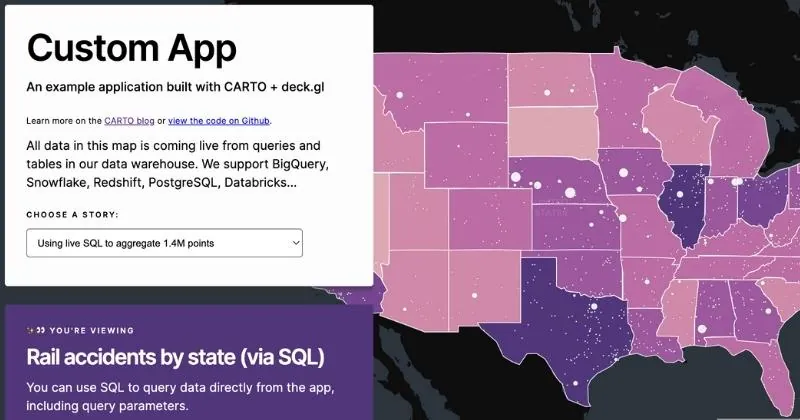 JavaScript is a widely used programming language that is used to create interactive and dynamic web content, rather than for data analysis and processing. For spatial use cases, JavaScript is often employed for creating interactive and visually appealing web maps. It allows developers to manipulate and visualize spatial data using libraries such as React and deck.gl. It is most useful for geospatial developers and data visualization experts.